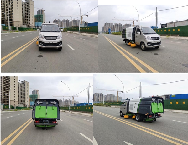 該掃路車長安國六二類底盤改裝,加裝副發動機、風機、清水箱、垃圾箱、左右立掃、后置吸盤,掃盤降塵系統,液壓系統、專用裝置電控系統和副車架等改裝而成。